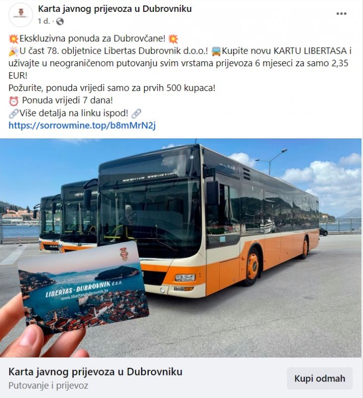 Na društvenoj mreži Facebook pojavila se objava koja koristeći identitet Libertasa nudi prodaju promotivnih kartica javnog prijevoza.